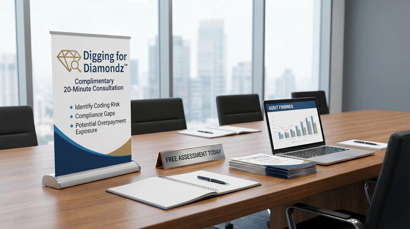 Every engagement begins with Digging for Diamondz™, a complimentary 20-minute consultation focused on identifying coding risk, compliance gaps, and potential overpayment exposure.